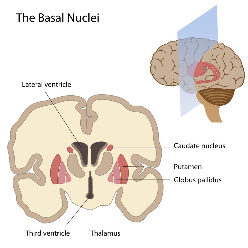 基底核是腦部深處的一組神經核團,主要負責規劃與啟動動作,確保動作流暢,並抑制不必要的顫抖。它主要由幾個部分組成:
